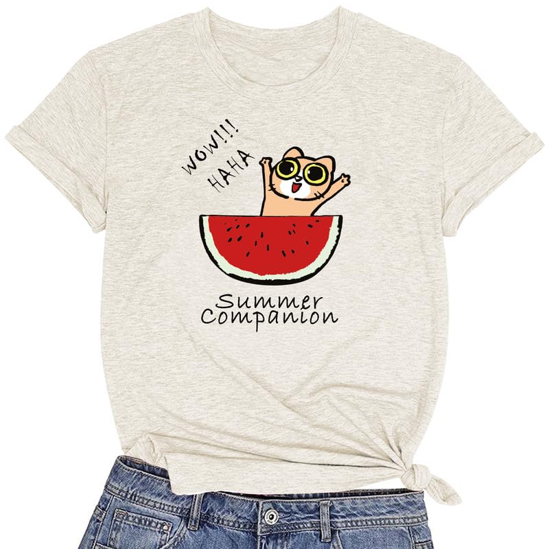 CORIRESHA Women's Cute Cat Crewneck Short Sleeve Casual Summer Letter T-Shirt