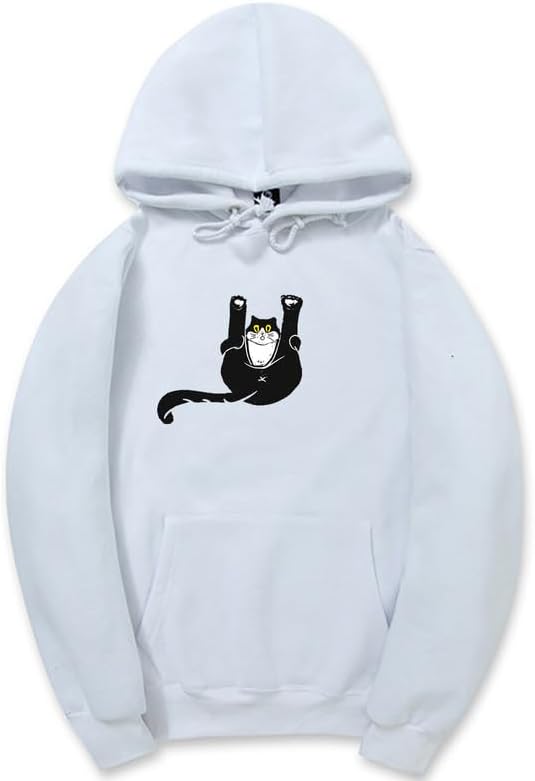 FEATURES: Adjustable drawstring hood, long sleeve pullover, fun black and white cat graphic, functional kangaroo pocket, fleece lining and ribbed trim, regular fit basic hoodie.